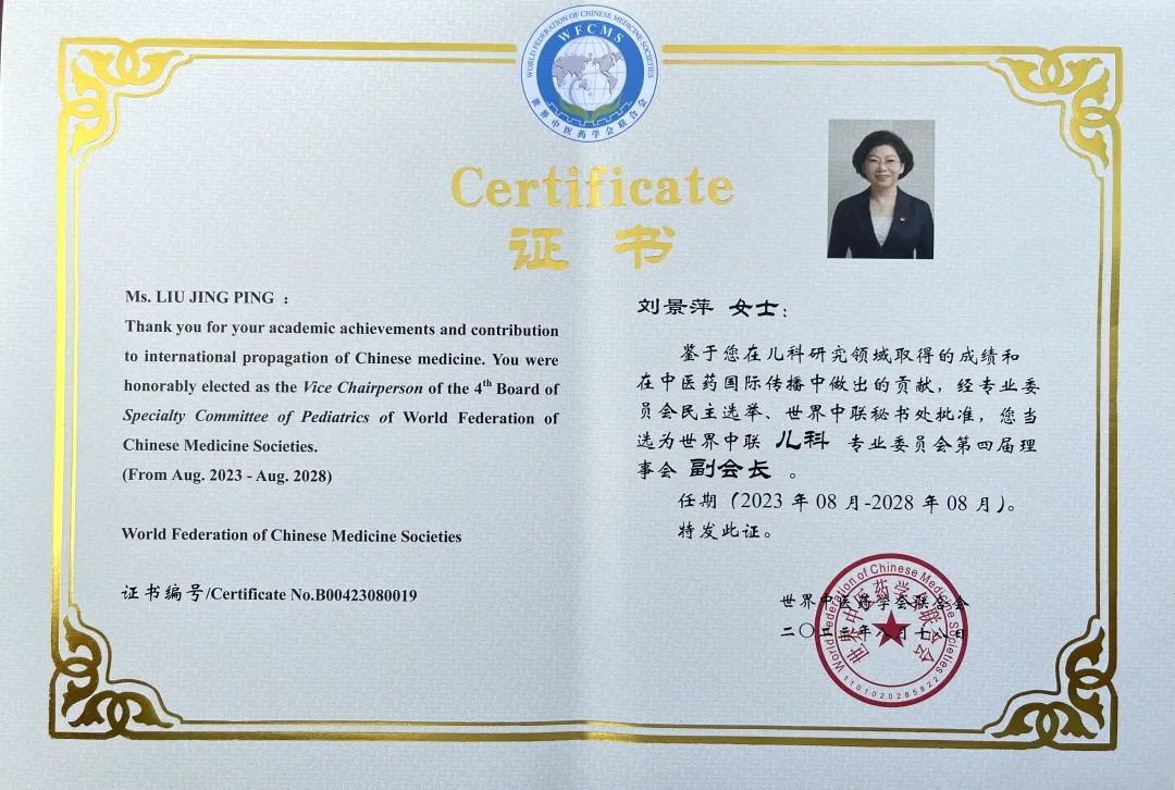 BG真人药业集团党委书记、董事长刘景萍当选世界中医药学会联合会儿科专业委员会第四届理事会副会长